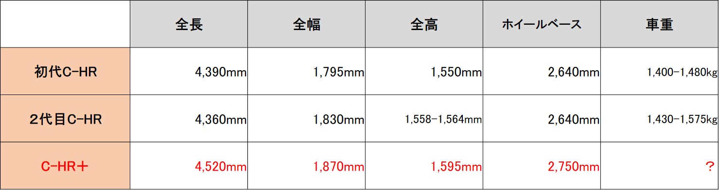 C-HR+の外寸はまだ、開発目標値であり、車重の記載も無いのですが、初代~C-HR+までの外寸の比較をすると、やはりC-HR+は初代、2代目と比べて一回り大きくなっていますね。1クラス上の車種という位置づけと考えてよいのではないでしょうか。